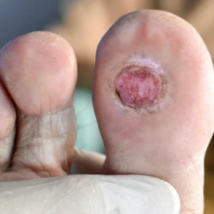 A diabetic foot ulcer is an open sore or wound that commonly occurs on the bottom of the foot in people with diabetes. High blood sugar levels can damage blood